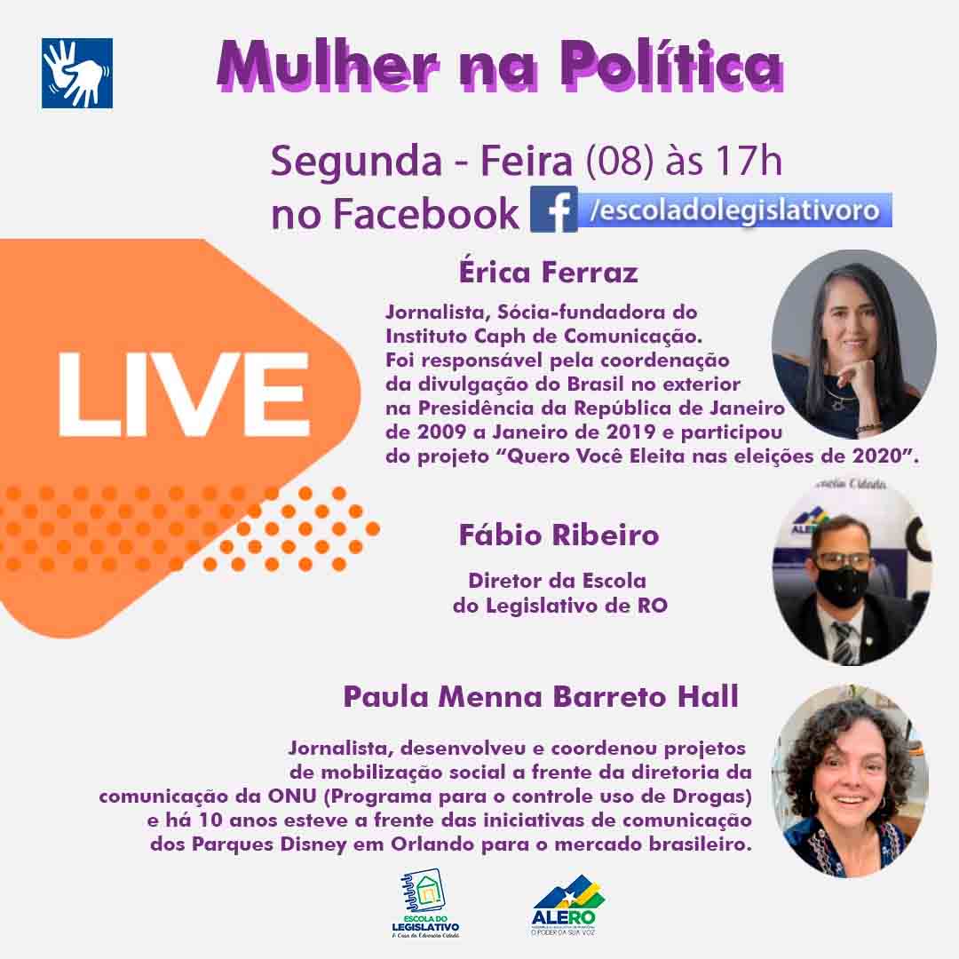 Na próxima segunda-feira (8), a partir das 17 horas (horário de Rondônia) a Escola do Legislativo, mantida pela Assembleia Legislativa (ALE), presidida pelo deputado Alex Redano (Republicanos) estará realizando live relacionada ao Dia Internacional da Mulher, que será comemorado no próximo dia 8. A participação da mulher na política, mínima para quem domina o colégio eleitoral no País, é o tema central da live da escola dos deputados.