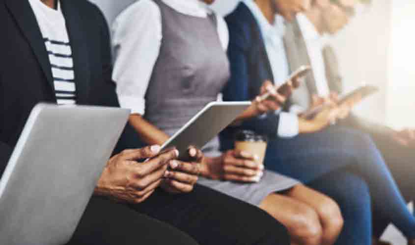Fila de pessoas sentadas, com homem negro segurando tablet e mulher negra segurando celular