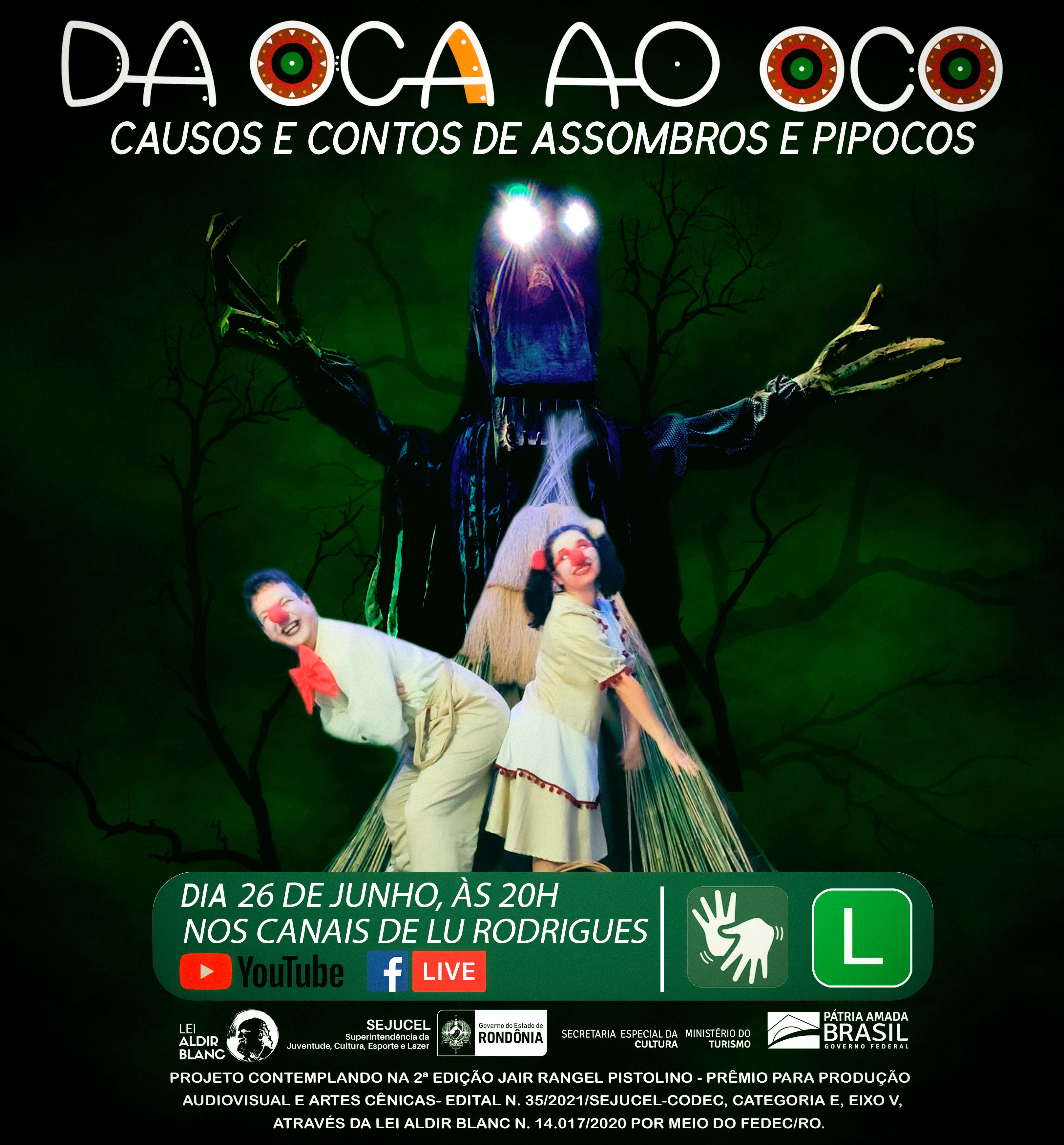 No próximo domingo (26), às 20h, no Canal do Youtube da artista Lu Rodrigues, estreia o espetáculo Da Oca Ao Oco: Causos e Contos de Assombros e Pipocos. O projeto que tem como proponente Lucimar Rodrigues foi contemplado na 2ª EDIÇÃO JAIR RANGEL PISTOLINO - PRÊMIO PARA PRODUÇÃO AUDIOVISUAL E ARTES CÊNICAS - Edital n. 35/2021/SEJUCEL-CODEC, categoria E, Eixo V, através da Lei Aldir Blanc n. 14.017/2020 por meio do FEDEC/RO.