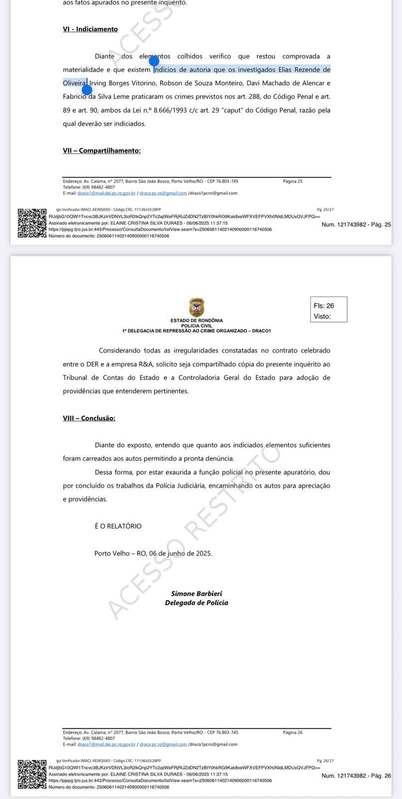 A delegada Simone Barbieri, responsável pela apuração, foi afastada da 1ª Draco logo após concluir o relatório com o indiciamento de Elias Rezende, o que acentuou as suspeitas de interferência política nas investigações, especialmente por envolver um dos auxiliares mais próximos do governador Marcos Rocha.