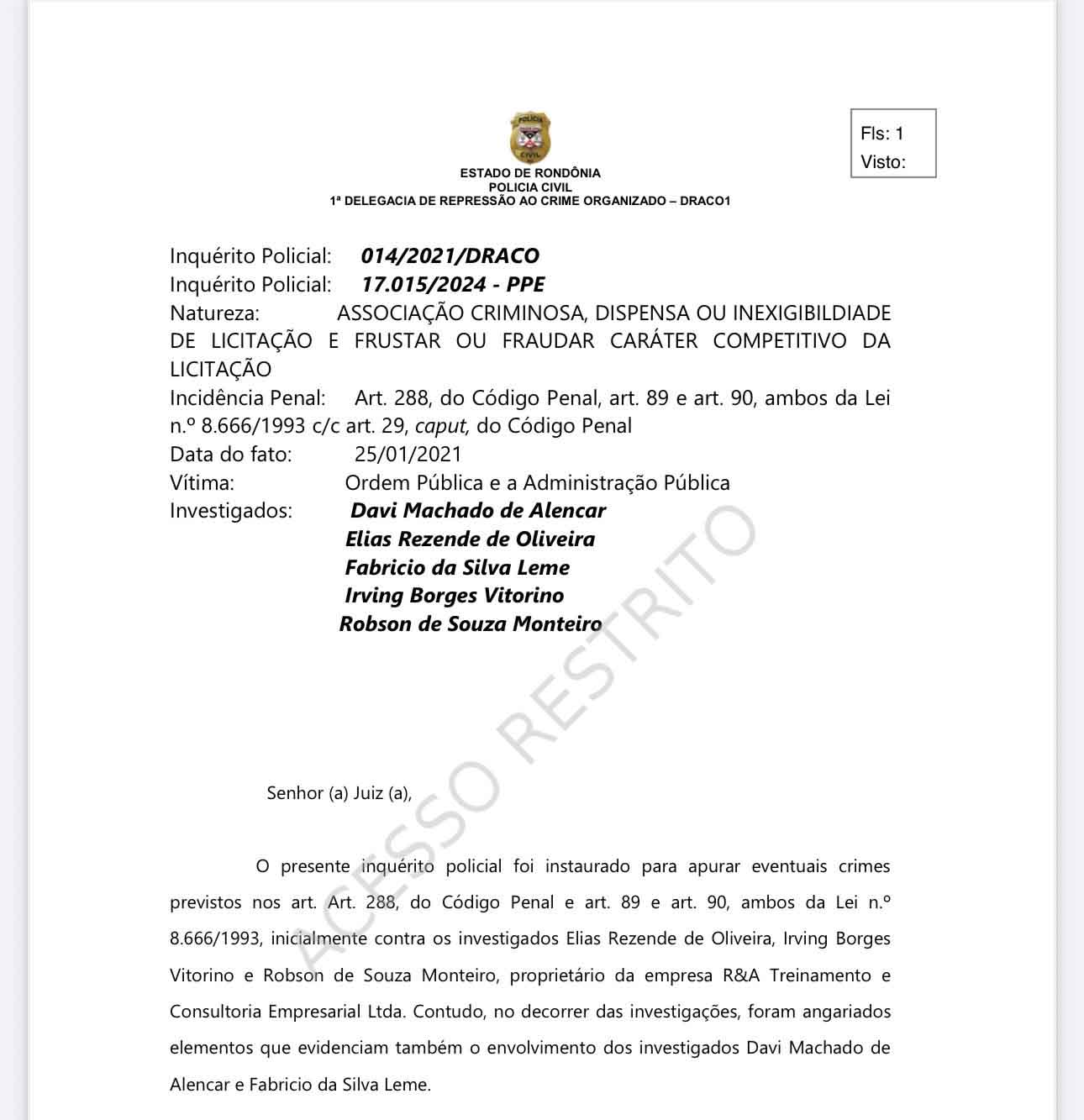 A investigação aponta Rezende como autor intelectual da contratação fraudulenta da empresa R&A Treinamento e Consultoria Empresarial Ltda., que custou ao povo de Rondônia mais de R$ 2 milhões para digitalizar documentos. A contratação foi direta, sem licitação, durante a gestão de Rezende no DER.