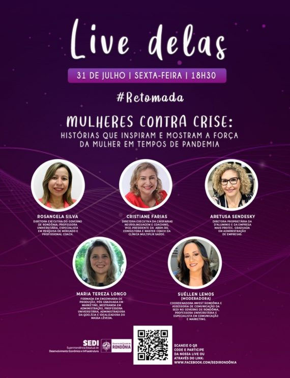“Mulheres contra a crise: histórias que inspiram e mostram a força da mulher em tempos de pandemia” é o tema da próxima live realizada pelo Governo de Rondônia, por meio da Superintendência Estadual de Desenvolvimento Econômico e Infraestrutura (Sedi), nesta sexta-feira (31), às 18h30, na plataforma do facebook da Superintendência.