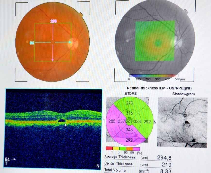 Trata-se do medicamento antiangiogênico – inibe o crescimento de novos vasos sanguíneos – e o exame de tomografia de coerência óptica.