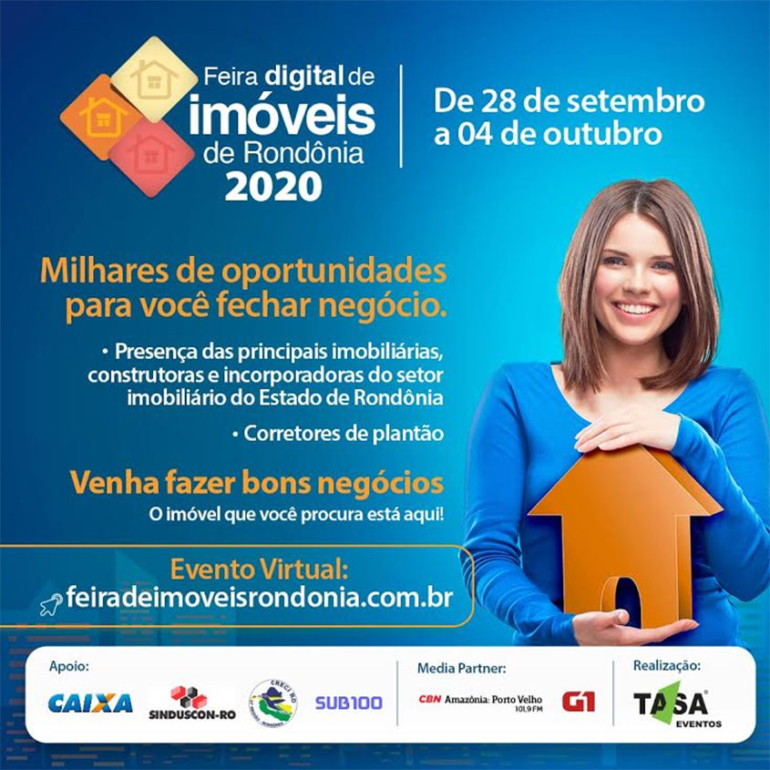 A Feira Digital de Imóveis de Rondônia é organizada pela Tasa Eventos, com apoio da Caixa Econômica Federal, SINDUSCON-RO, CRECI-RO e SUB 100 Imóveis.