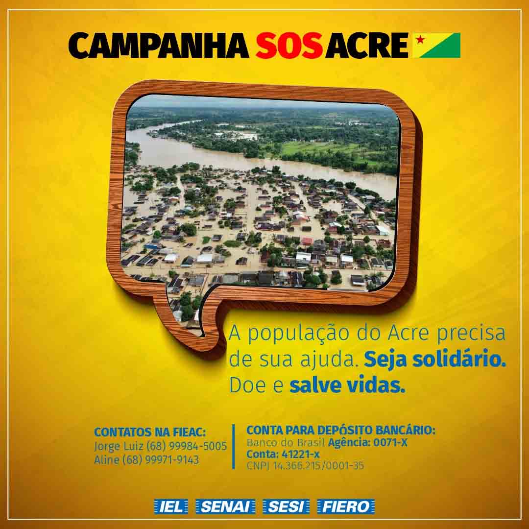 A Federação das Indústrias do Estado do Acre (FIEAC) informa que as doações em espécie podem ser feitas através da chave PIX: [email protected] e pela conta bancária do Banco do Brasil: Agência: 0071-X conta: 41221-X CNPJ: 14.366.215/0001-35.