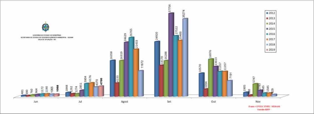 A avaliação dos gráficos por meio dos dados coletados pelo satélite NPP-Suomi, referência da Nasa (Administração Nacional da Aeronáutica e Espaço) que detecta 10 vez mais os focos de calor, onde toda a série de dados de Rondônia se baseia, apresenta o histórico mensal de queimadas desde 2012, com comparativo ao ano anterior. Observa-se que a maior incidência, historicamente, acontece no mês de setembro. Os informativos especiais de alerta sobre os focos de calor são enviados com amostragem do cenário climático, para subsidiar as ações de fiscalização e combate da Defesa Civil, Corpo de Bombeiros Militar, gestores públicos e equipes da Sedam.