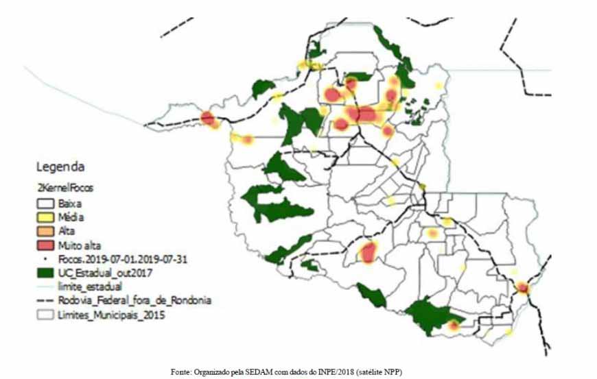 Segundo o último relatório, a partir dos registros via satélite, Porto Velho é o município que mais realizou queimadas, com registro de 1,504 mil focos de calor nesse mês de julho em 2019; seguido por Nova Mamoré, com 570; e Cujubim, com 494. Porém, segundo o meteorologista da Sedam, Fábio Monteiro Saraiva, é maior a preocupação em relação a análise dos municípios mais comprometidos por área demográfica, conforme o gráfico de densidade de calor (medido pelo Mapa de Kelner, que reúne os dados em um raio de 30 quilômetros, mostrando as maiores concentrações ao gestor, que consegue trabalhar a ferramenta geoestatística para o planejamento de ações), como é o caso dos municípios de Cujubim, Alto Alegre dos Parecis e Buritis.