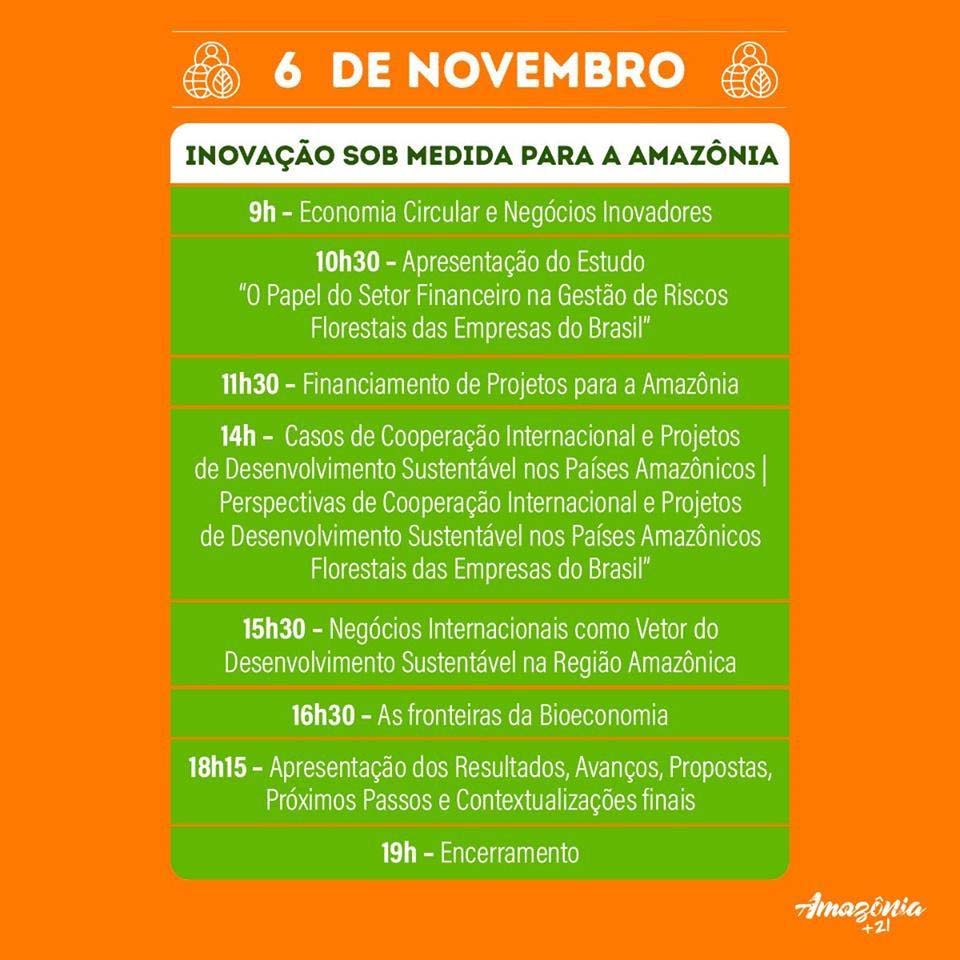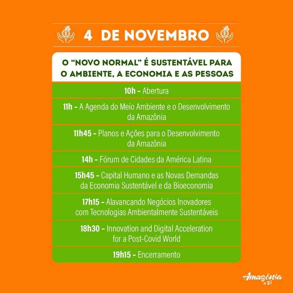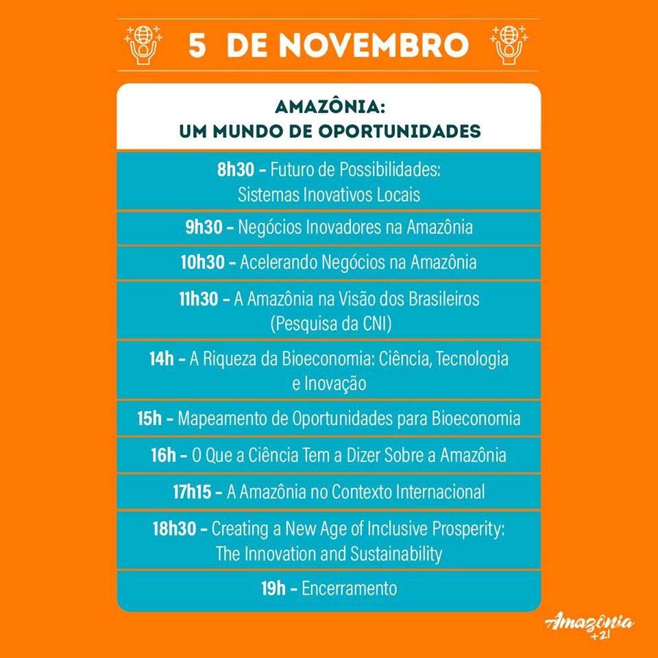 Os debates sobre os desafios e as soluções para a Amazônia se darão a partir de quatro eixos temáticos: negócios sustentáveis, cultura, financiamento dos programas e ciência, tecnologia e inovação. Para participar, inscreva-se gratuitamente no site amazonia21.org. O evento conta com tradução simultânea em inglês e espanhol.