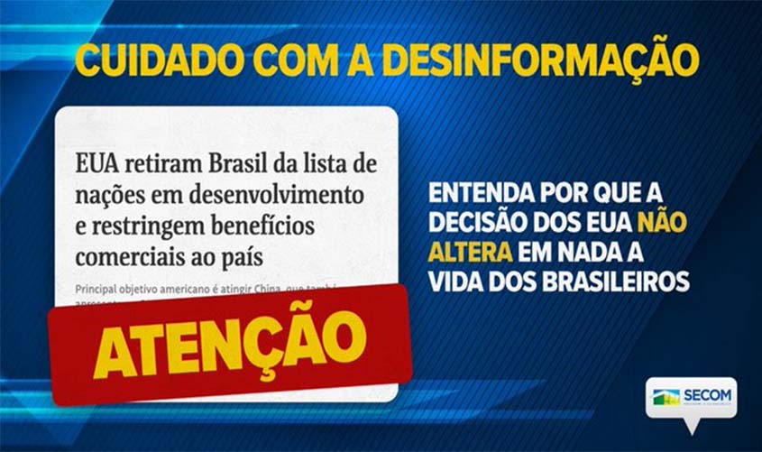 A Secretaria Especial de Comunicação Social (Secom) da Presidência da República divulgou em seu Twitter na noite de ontem (11) postagens sobre a posição norte-americana de rever a lista de países em desenvolvimento, retirando o Brasil dessa categoria.