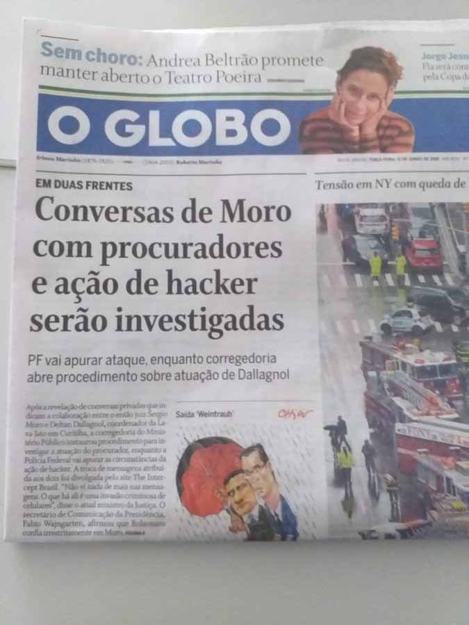 "Por exemplo: essa manchete do @JornalOGlobo é difícil de acreditar. A estratégia da Globo é a mesma que os governos usam contra aqueles que revelam seus crimes: focar em como as infos foram obtidas e ignorar as revelações. Eles mal mencionaram as impropriedades de Moro".