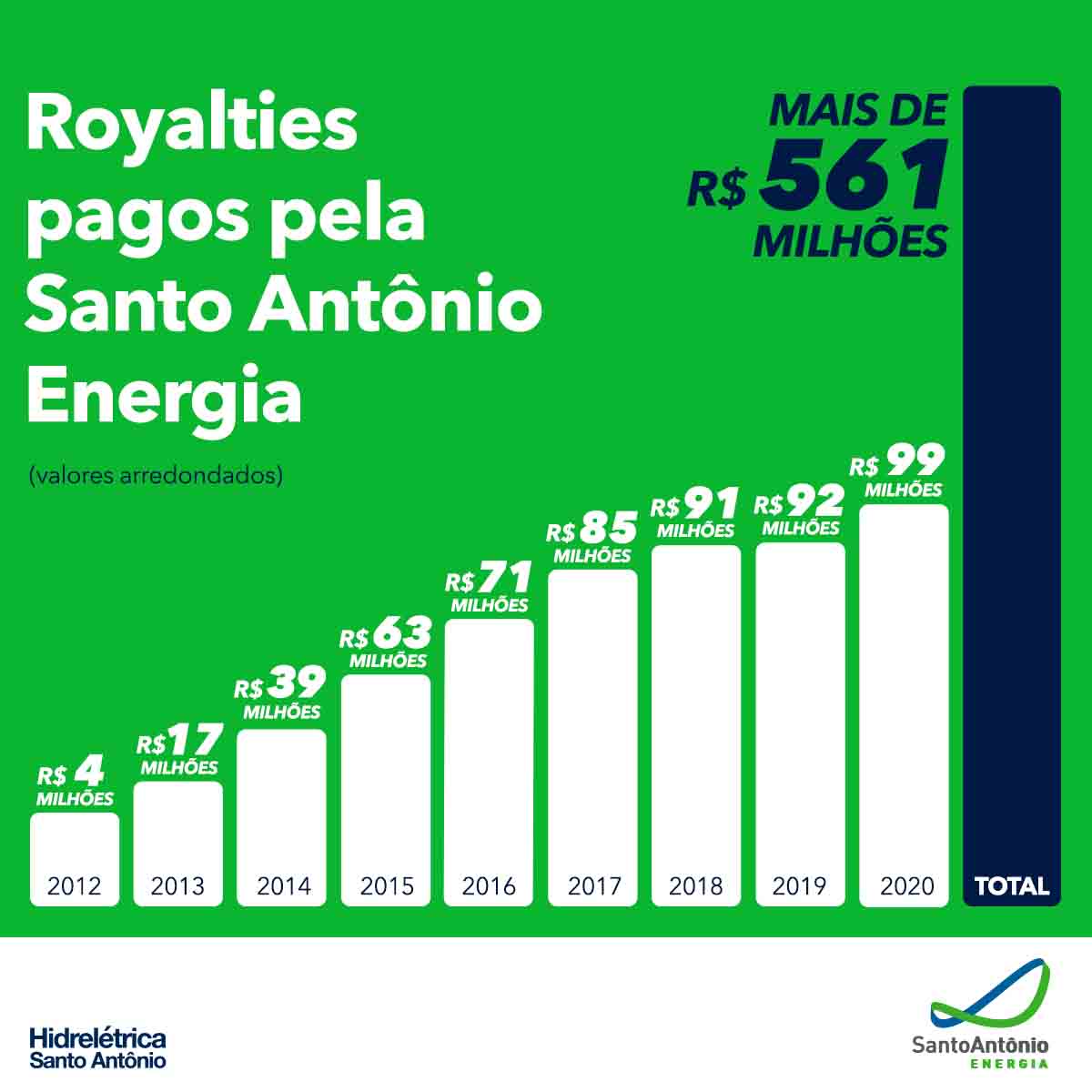 A Hidrelétrica Santo Antônio já pagou mais de R$ 561 milhões em royalties desde que começou a gerar energia, em março de 2012. Somente no ano passado foram pagos quase R$ 100 milhões.