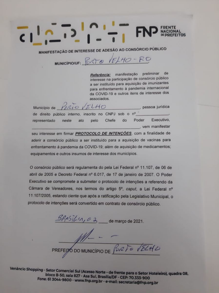 O prefeito de Porto Velho, Hildon Chaves, firmou em Brasília, nesta terça-feira (02), protocolo de intenções para aderir ao consórcio público que será instituído pela Frente Nacional de Prefeitos para a aquisição de vacinas contra a Covid-19. Segundo ele, a iniciativa leva em conta os atrasos no cronograma nacional de vacinação.