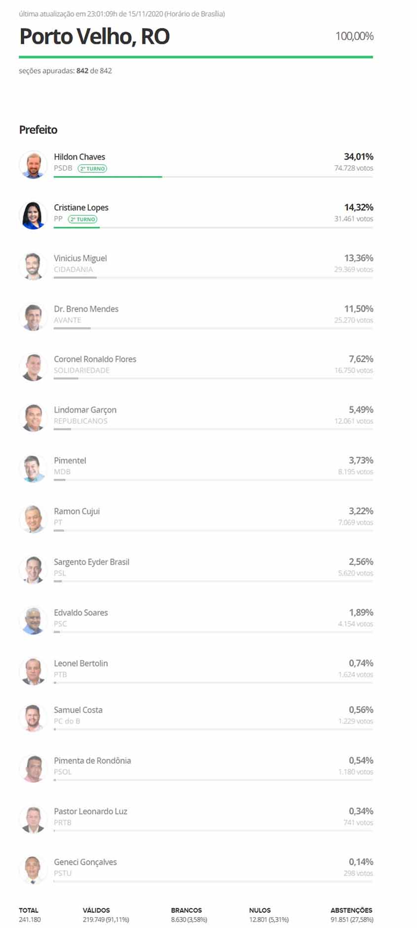 A disputa eleitoral pela Prefeitura de Porto Velho (RO) foi para segundo turno. Com 100% das urnas apuradas, o atual prefeito Hildon Chaves (PSDB) levou 34,01% dos votos válidos (74.728 votos) e vai disputar com Cristiane Lopes (PP), que teve 14,32% (31.461 votos).