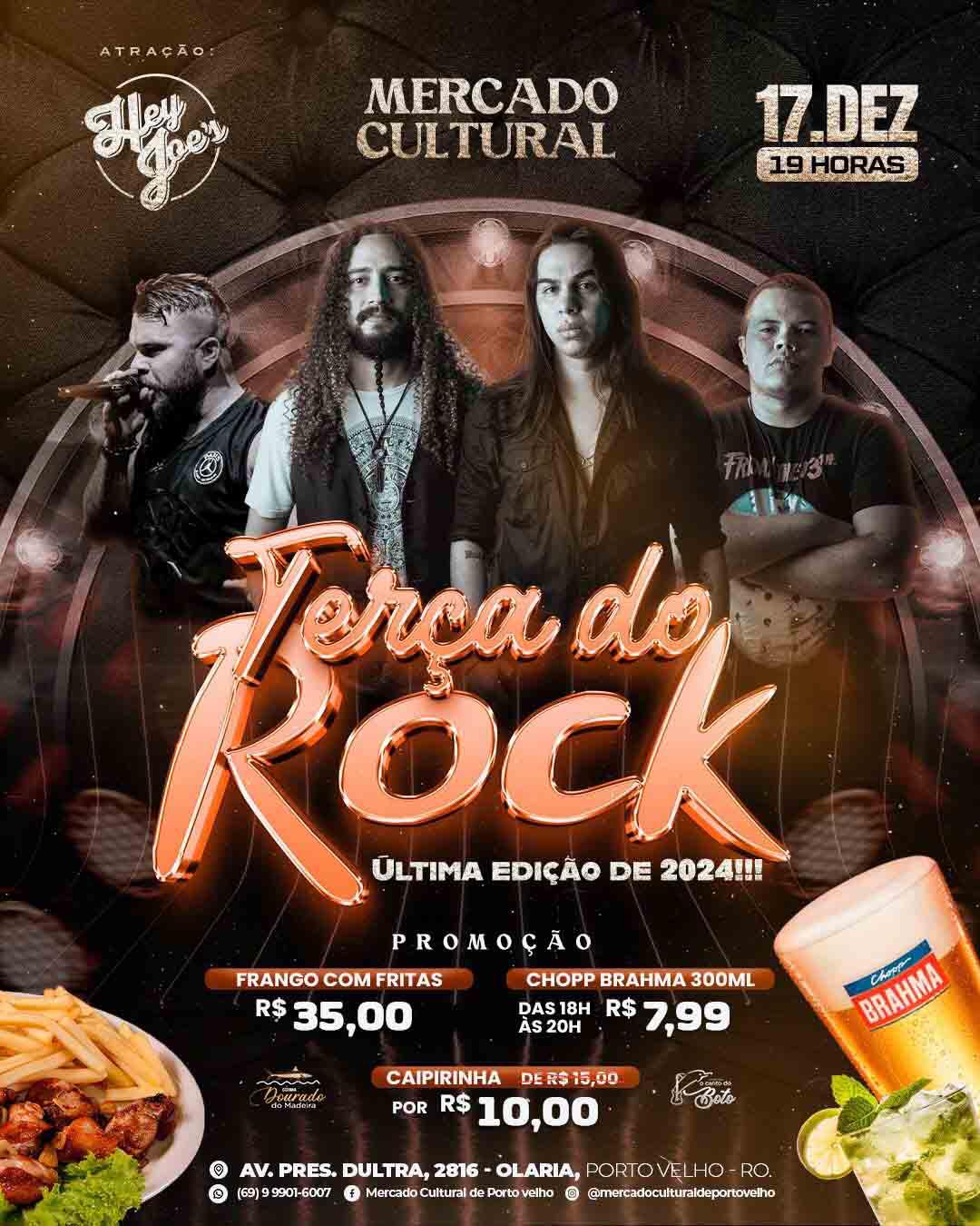 “Recado para os amantes do rock and roll, hoje, dia 17 de dezembro, a partir das 19h, vamos realizar a última edição de 2024 da tradicional ‘Terça do Rock’ do Mercado Cultural de Pvh, com o show da banda porto-velhense Hey Joe”, enfatizou o empresário Sinezio Tapajos, permissionário do box Dourado do Madeira.