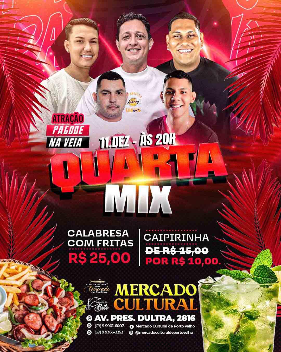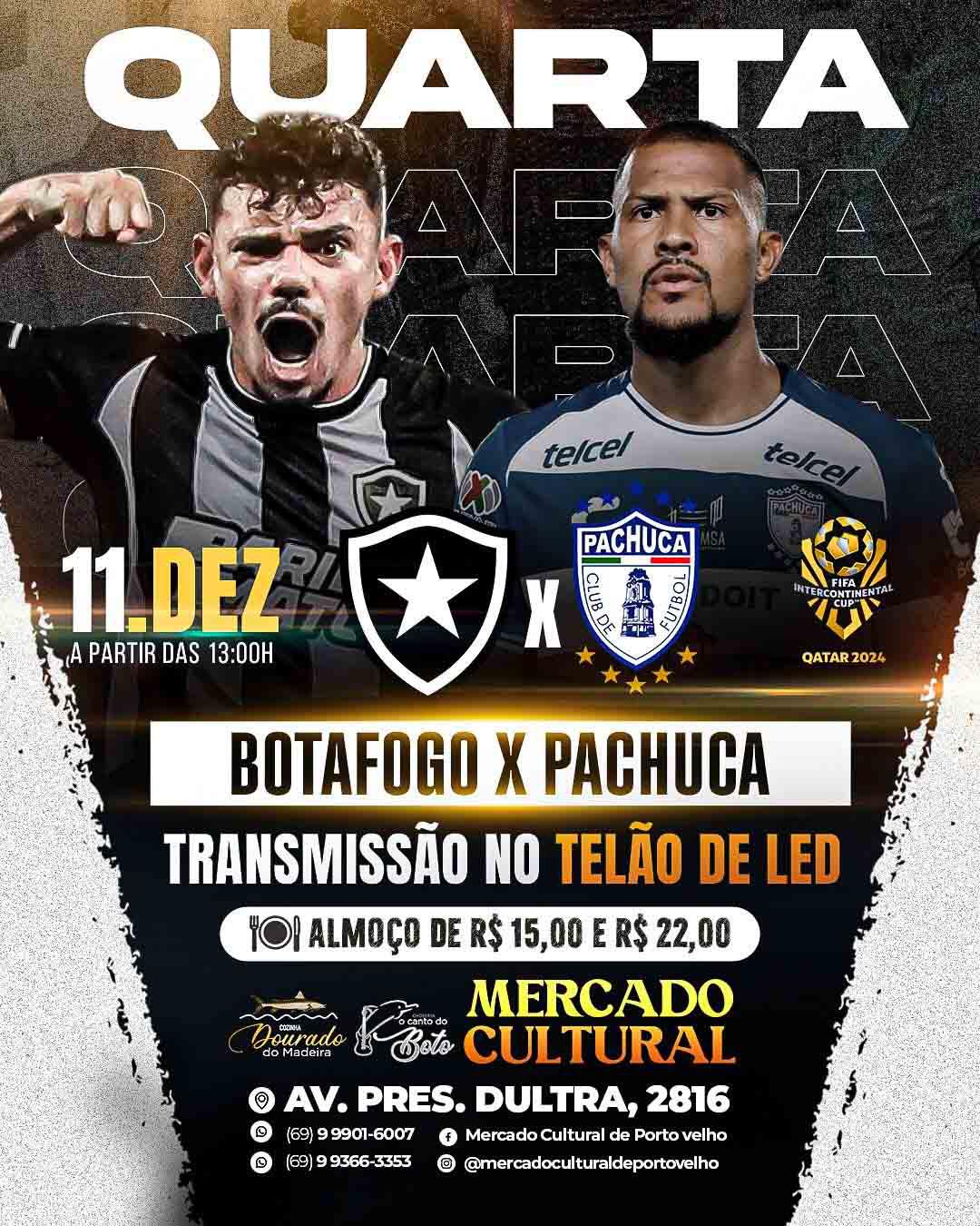 "Na nossa tradicional 'Quarta Das Comidas Nordestinas', que começa às 10h40 e prossegue até 14h40, no Mercado Cultural de Pvh", iremos transmitir em telão de Led o jogo do Botafogo X Pachuca, disse o empresário Sinésio Tapajós, permissionário do box Dourado do Madeira acrescentando que ainda hoje, às 20h, teremos show do grupo Pagode Na Veia.