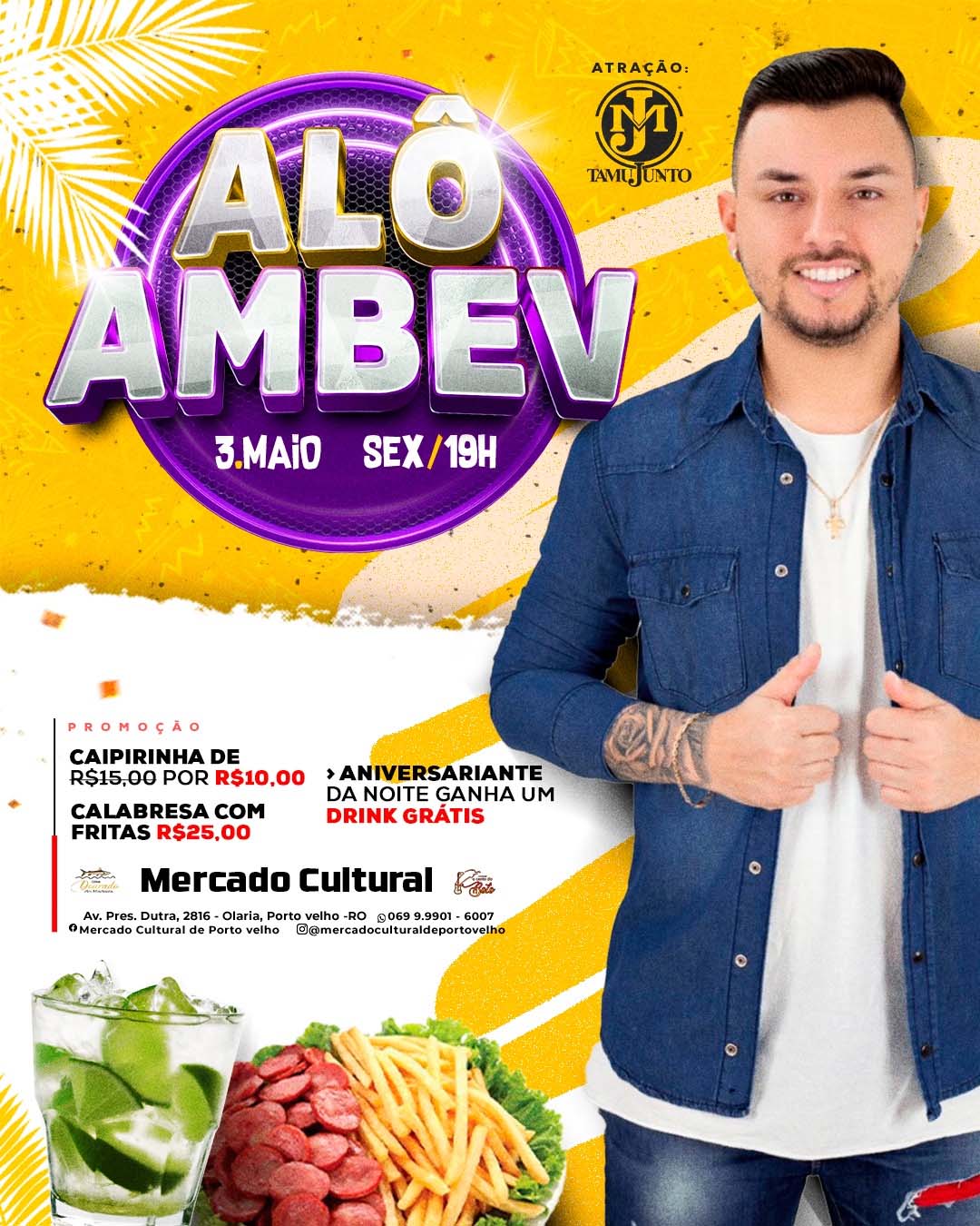 No evento músical 'Alô AmBev, a Festa', dia 3, a partir das 19h40, tem show do grupo de pagode Tamujunto, onde terá promoções de bebidas e petisco.