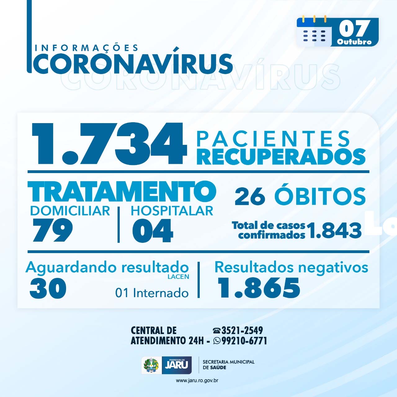 A Secretaria Municipal de Saúde (Semusa), atualizou nesta quarta-feira (7), o Boletim informativo dos casos de Covid-19, em Jaru (RO). Conforme a Semusa, neste momento são 1.734 pessoas recuperadas. Há também 79 pacientes em tratamento domiciliar e quatro pacientes fazem tratamento no Hospital Municipal.