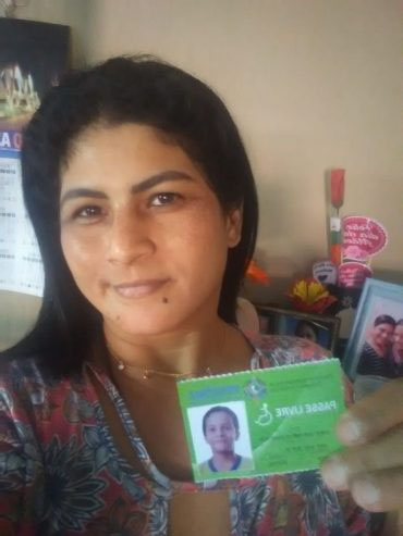 Adriana mostra com alegria a carteira de passe livre do filho