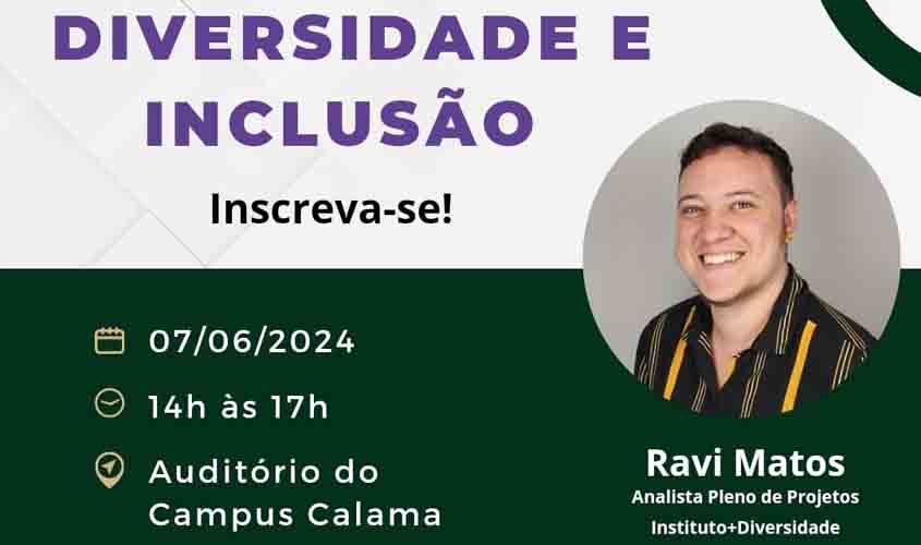 O Instituto Federal de Educação, Ciência e Tecnologia de Rondônia (IFRO) - Campus Porto Velho Calama, em parceria com o Instituto + Diversidade, realizará uma formação sobre inclusão e diversidade em Porto Velho, por meio da Diretoria de Programas e Projetos e da Pró-Reitoria de Extensão. O evento acontecerá no auditório do Campus Calama, nesta sexta-feira, dia 07 de junho, a partir das 14 horas e será ministrada pelo analista pleno de projetos do Instituto + Diversidade, Ravi Matos.