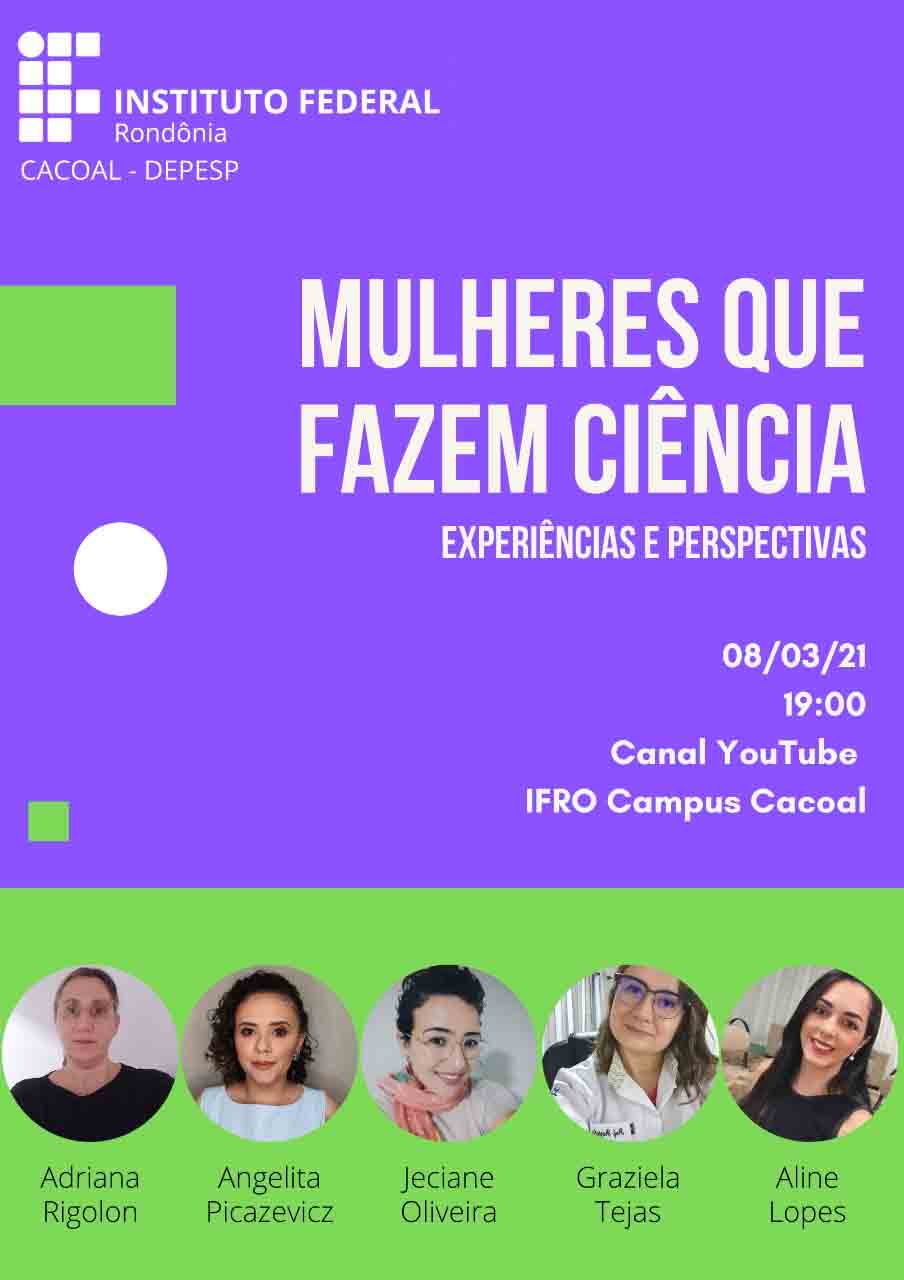 “Mulheres que fazem ciência: experiências e perspectivas” é o tema da live que será realizada pelo Departamento de Pesquisa, Inovação e Pós-Graduação (DEPESP) do Instituto Federal de Educação, Ciência e Tecnologia de Rondônia (IFRO), Campus Cacoal. A atividade ocorrerá no dia 8 de março (2021), às 19h, e será transmitida via Youtube, no canal da unidade, por meio do link: https://youtu.be/14WFi0XzXOg.