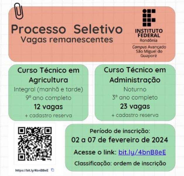 O Instituto Federal de Educação, Ciência e Tecnologia de Rondônia (IFRO), Campus Avançado São Miguel do Guaporé, abriu seleção para 25 vagas, além da formação de cadastro reserva. A seleção busca o preenchimento de vagas remanescentes do processo seletivo 2024/1 nos Cursos Técnicos em Agricultura Integrado ao Ensino Médio (integral: manhã e tarde) e em Administração Subsequente ao Ensino Médio (noturno). A vaga que poderá ser pleiteada por qualquer candidato interessado que cumpra os requisitos do edital.
