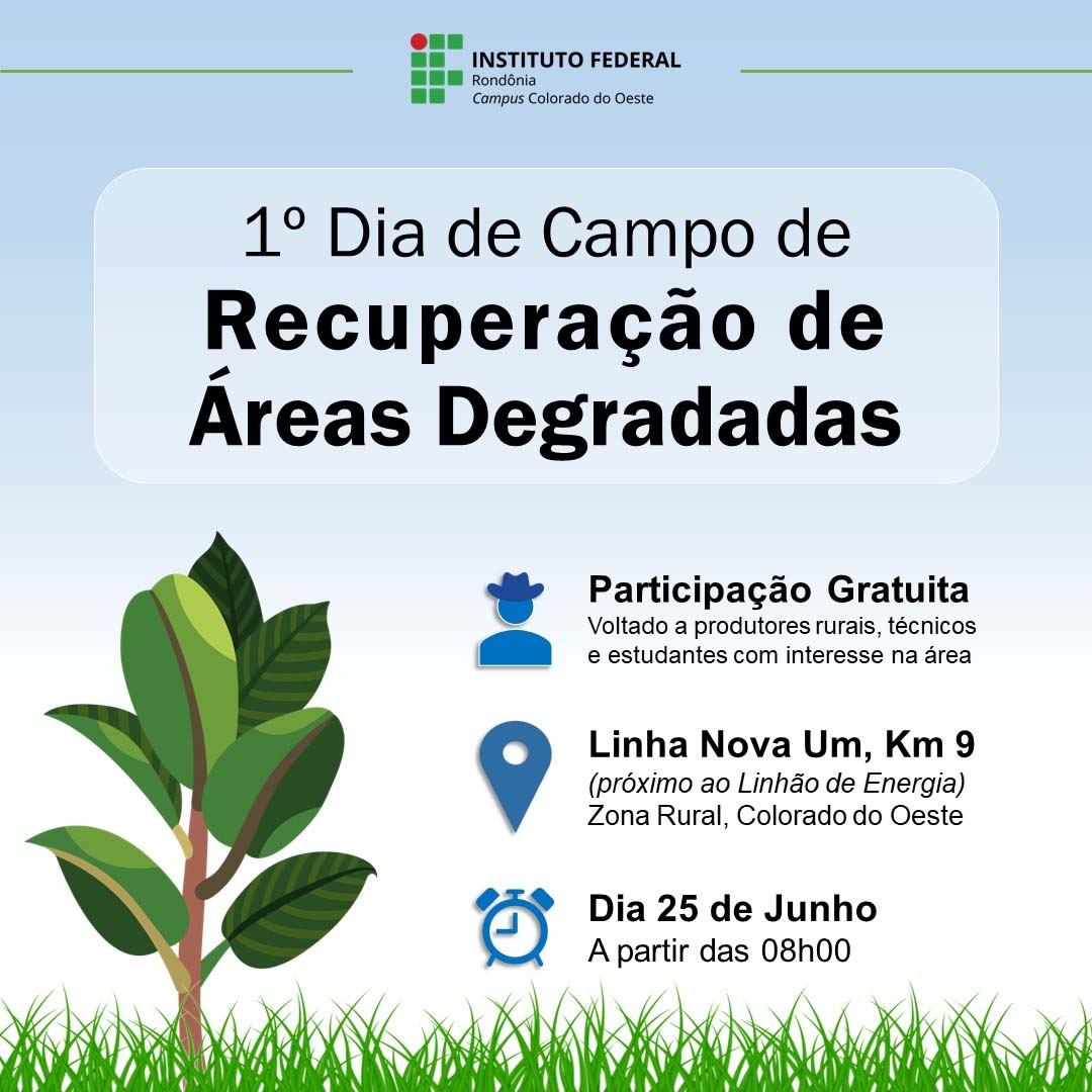 O Instituto Federal de Rondônia (IFRO), Campus Colorado do Oeste, realizará o 1º Dia de Campo de Recuperação de Áreas Degradadas no sábado, 25 de junho de 2022. O evento é gratuito e voltado a produtores rurais, técnicos, alunos e demais interessados no assunto. Serão abordados temas como: adequação ambiental, métodos de recuperação, crédito rural, produção de mudas e cuidados após o plantio.