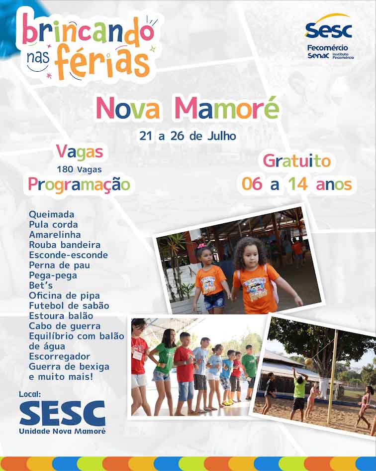 Estão abertas as inscrições para o projeto “Brincando nas Férias”. Essa edição vai acontecer na unidade de Nova Mamoré. Serão seis dias de pura diversão, com atividades recreativas, esportivas, educativas e culturais. Podem participar crianças e adolescentes de 06 a 14 anos dependentes do trabalhador do comércio e público em geral.