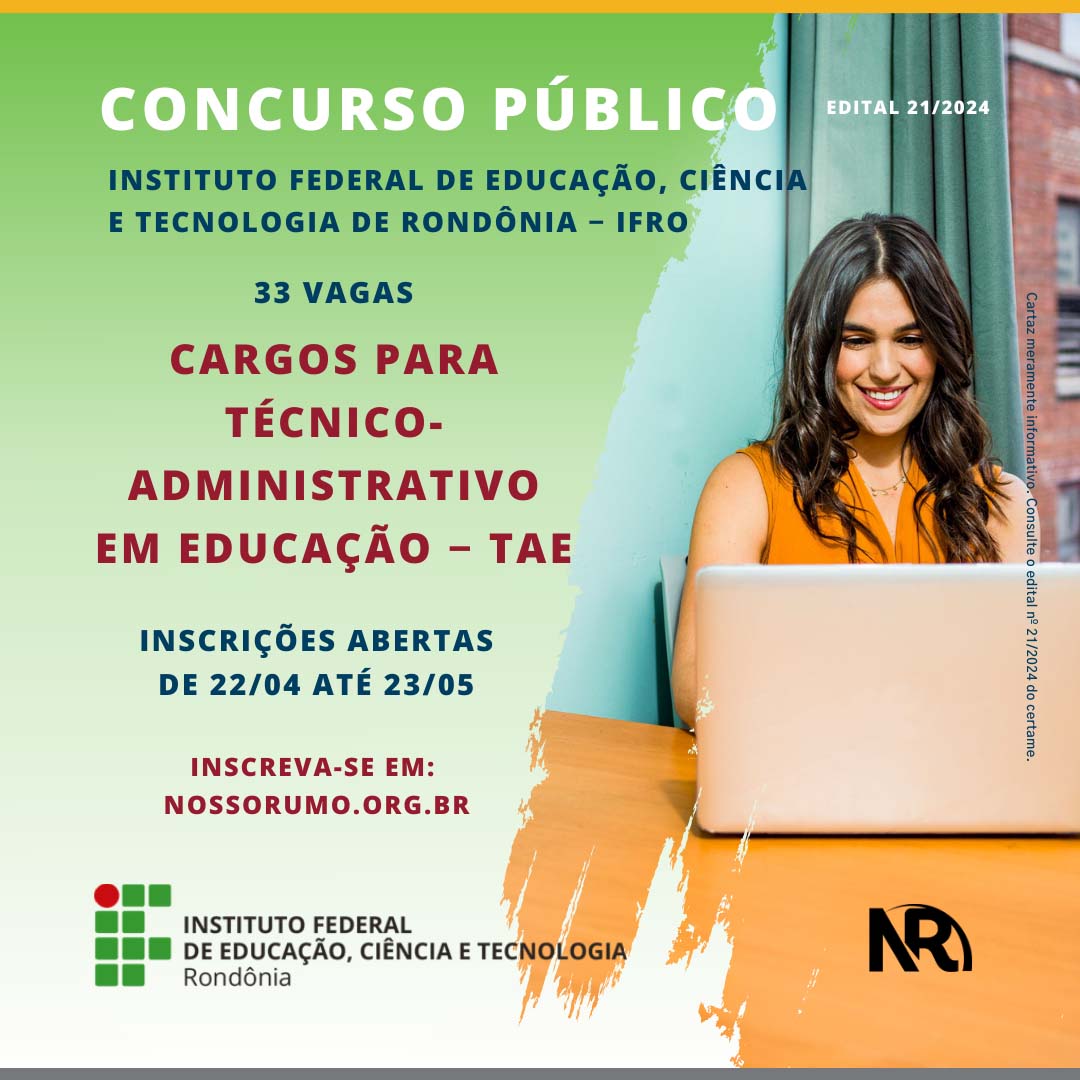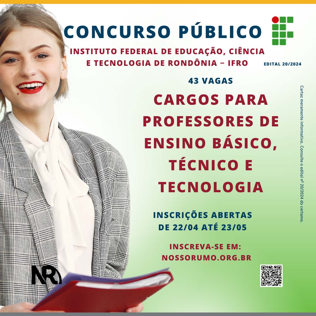 Seguem abertas as inscrições para os Concursos Público do Instituto Federal de Educação, Ciência e Tecnologia de Rondônia ‒ IFRO, com hora e data prevista para encerramento às 23h59 do dia 23 de maio de 2024, conforme horário de Brasília/DF. Interessados poderão realizar as inscrições através do site da instituição organizadora Nosso Rumo (www.nossorumo.org.br).