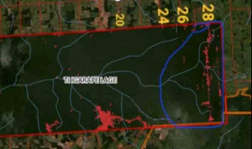 Através de áudios e de um mapa do “cabeça” que vazaram, a Polícia Federal descobriu o objetivo da organização criminosa em lotear mais 20.000 hectares (10 km x 20 km) da Terra Indígena, entre as linhas 20 a 25 [linhas com numeração de cor branca].