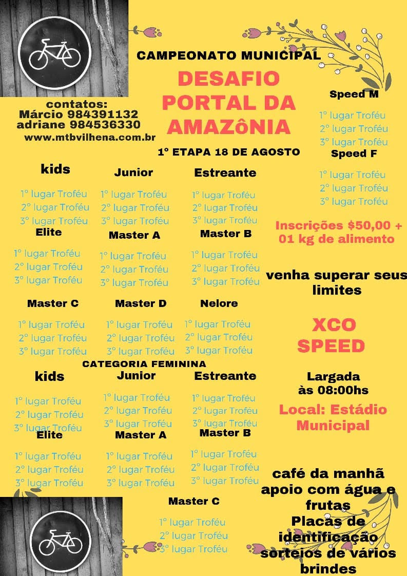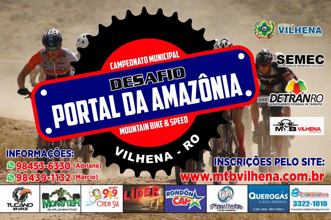 O Desafio Portal da Amazônia contará com 18 categorias para homens e mulheres (a partir de 8 anos de idade), premiando os vencedores com 54 troféus. As inscrições devem ser realizadas através do site www.mtbvilhena.com.br. Para mais informações entrar em contato com Márcio Souza (69) 98439-1132 ou Adriane Souza (69) 98453-6330.