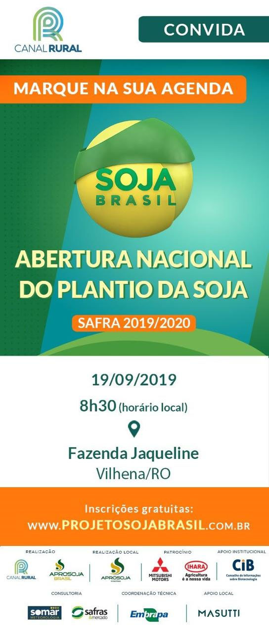 A cerimônia de Abertura Nacional do Plantio da Soja – Safra 2019/2020 será no dia 19 de setembro. É uma realização da Associação dos Produtores de Soja de Rondônia (Aprosoja-RO) e do Canal Rural.