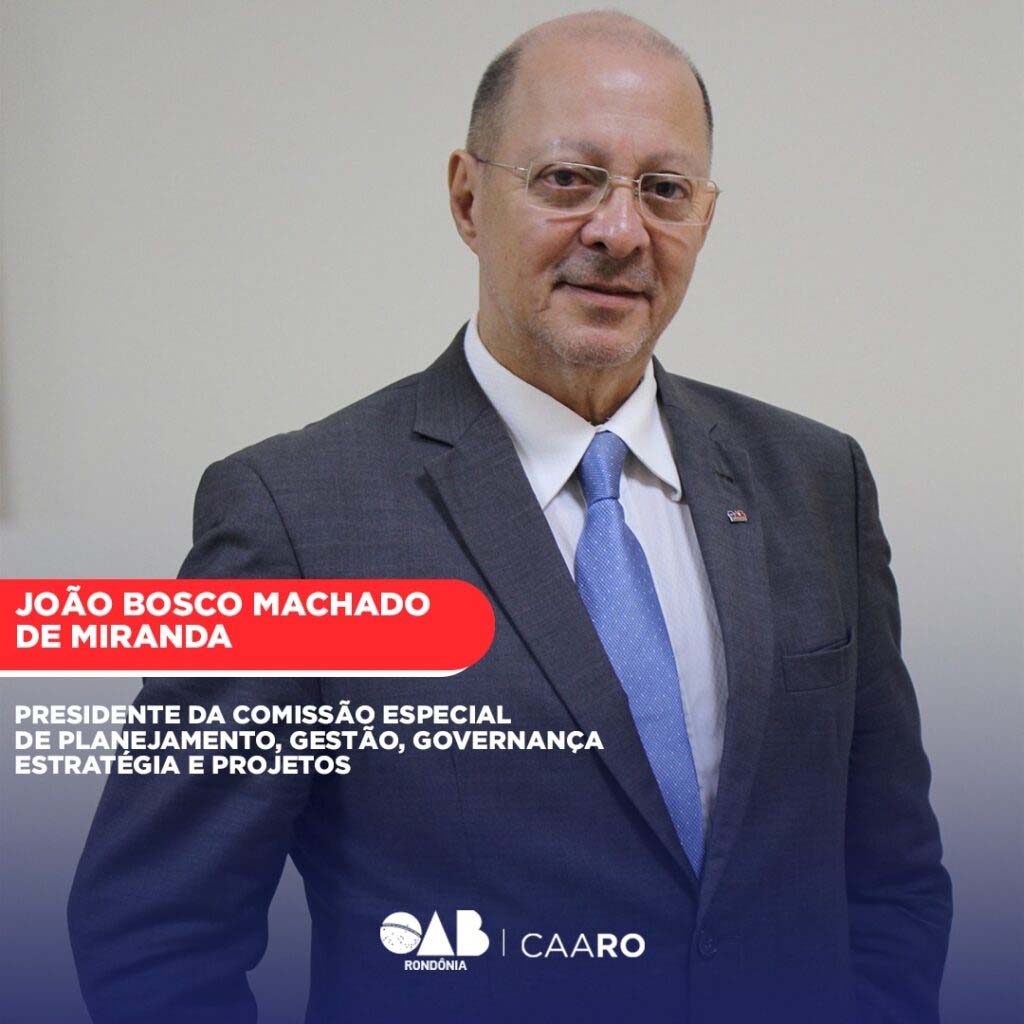 Advogado, conselheiro seccional, consultor em gestão estratégica e palestrante, João Bosco Machado de Miranda foi nomeado pelo presidente Márcio Nogueira para presidir a Comissão Especial de Planejamento, Gestão, Governança Estratégia e Projetos, aprovada e criada na atual gestão.