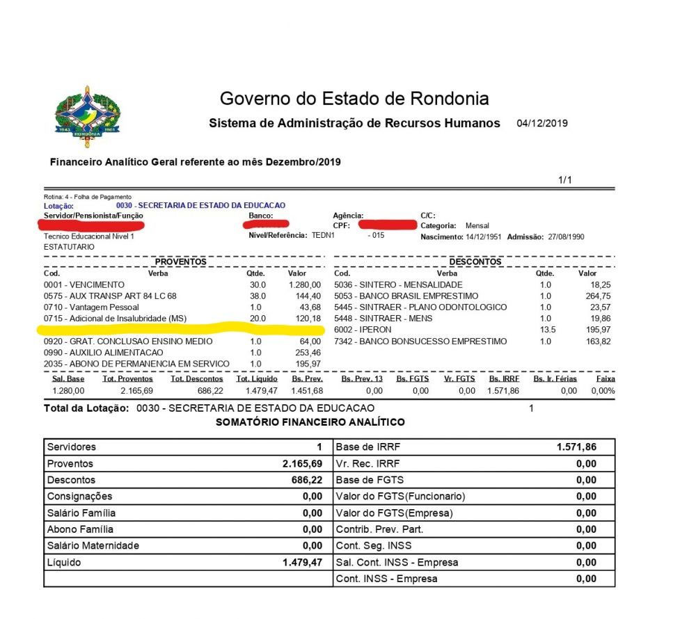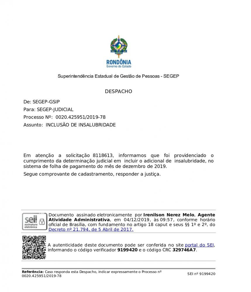 juiz da 1º Vara de Fazenda Pública concedeu decisão favorável ao processo nº0013752-96.2013.8.22.0001, impetrado pela assessoria jurídica do Sintero, que requeria o pagamento do adicional de insalubridade aos servidores estaduais lotados no arquivo geral. Em cumprimento à ação judicial, o Estado de Rondônia informou que o pagamento do adicional foi realizado no mês de dezembro de 2019.