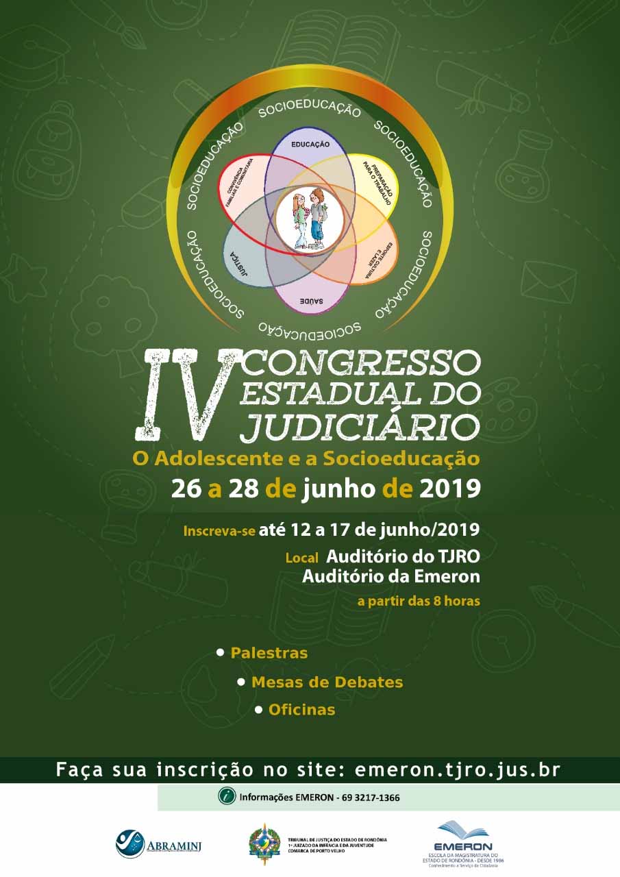Promovido pela Escola da Magistratura (Emeron), o Congresso Estadual do Judiciário está na quarta edição e acontece entre os dias 26 e 28 de junho, nos auditórios do TJRO e da Emeron. Esse ano, o evento traz como temática central “O Adolescente e a Socioeducação”. A exposição de boas práticas visa dar visibilidade a iniciativas exitosas na socioeducação promovendo a troca de experiências entre os atores do sistema de garantias de direitos.