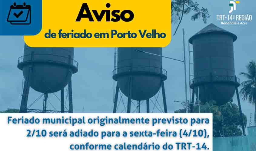 O Tribunal Regional do Trabalho da 14ª Região (RO/AC) informa que o feriado municipal de 2 de outubro, alusivo à Criação do Município de Porto Velho, será transferido para o dia 4 de outubro de 2024 (sexta-feira).