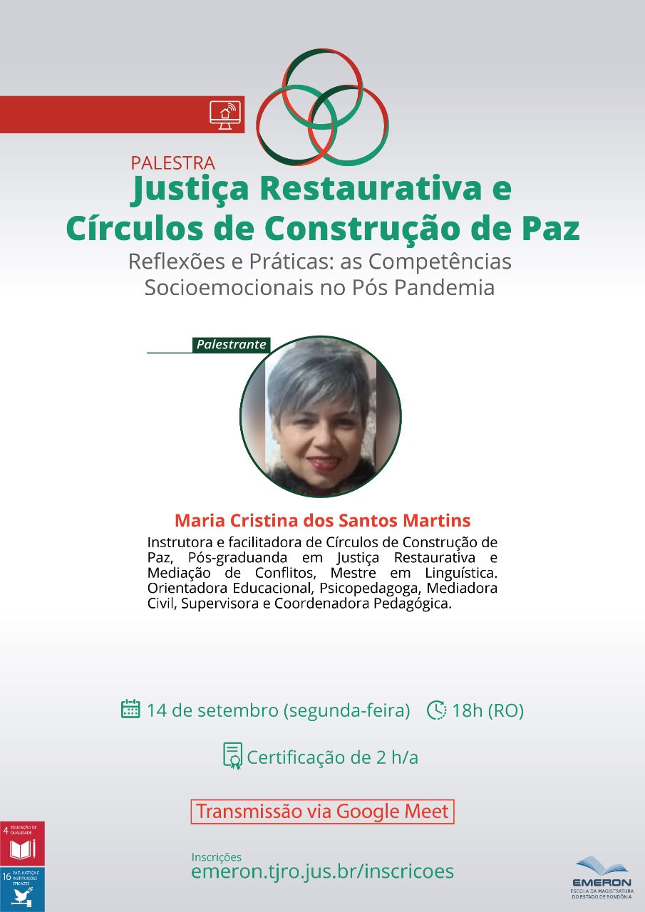 A Escola da Magistratura do Estado de Rondônia (Emeron) promoverá no próximo dia 14 de setembro, às 18h, a live Justiça Restaurativa e Círculos de Construção de Paz - Reflexões e Práticas: as Competências Socioemocionais no Pós Pandemia, que contará com a participação da professora gaúcha Maria Cristina dos Santos Martins. A palestra será transmitida ao vivo no canal da Emeron no YouTube (youtube.com/EscolaEmeron) e terá certificação de 2 horas-aula aos participantes.