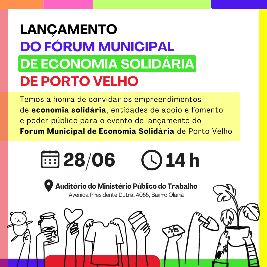 A Prefeitura de Porto Velho, por meio da Secretaria Municipal de Indústria, Comércio, Turismo e Trabalho (Semdestur), através do Departamento de Desenvolvimento Socioeconômico (DDS), participa da organização e lançamento do Fórum Municipal de Economia Solidária, que acontece nesta sexta-feira (28), no auditório do Ministério Público do Trabalho.