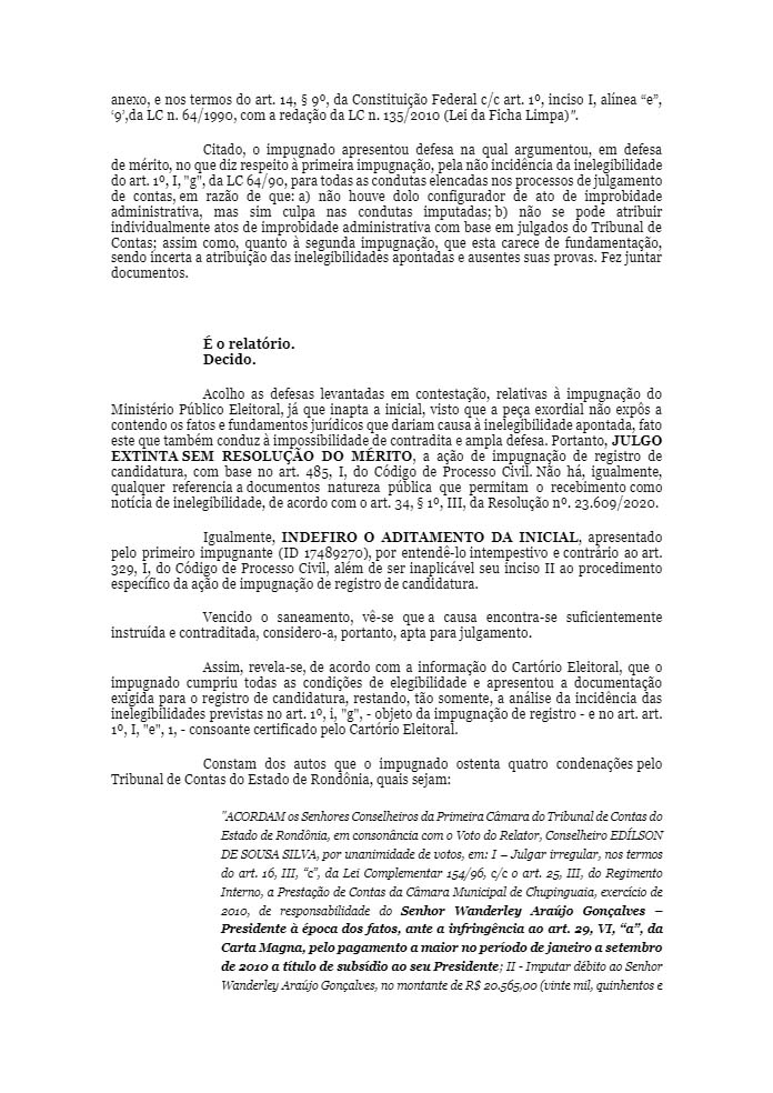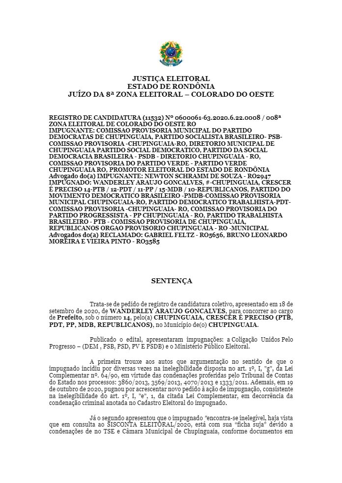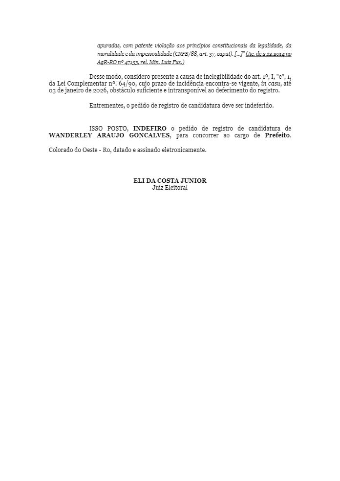 O candidato a prefeito Wanderley Araújo Gonçalves, que lidera a coligação “Chupinguaia, crescer é preciso”, teve seu registro de candidatura indeferido pela Justiça Eleitoral