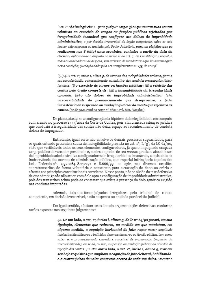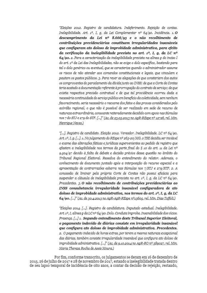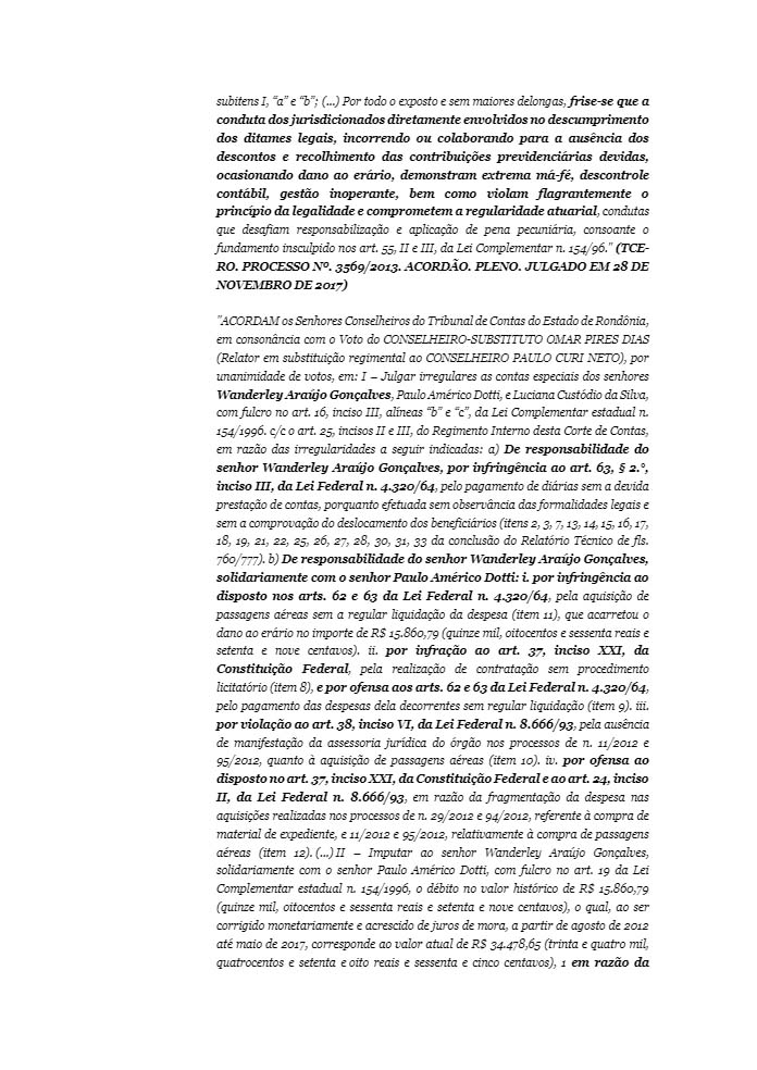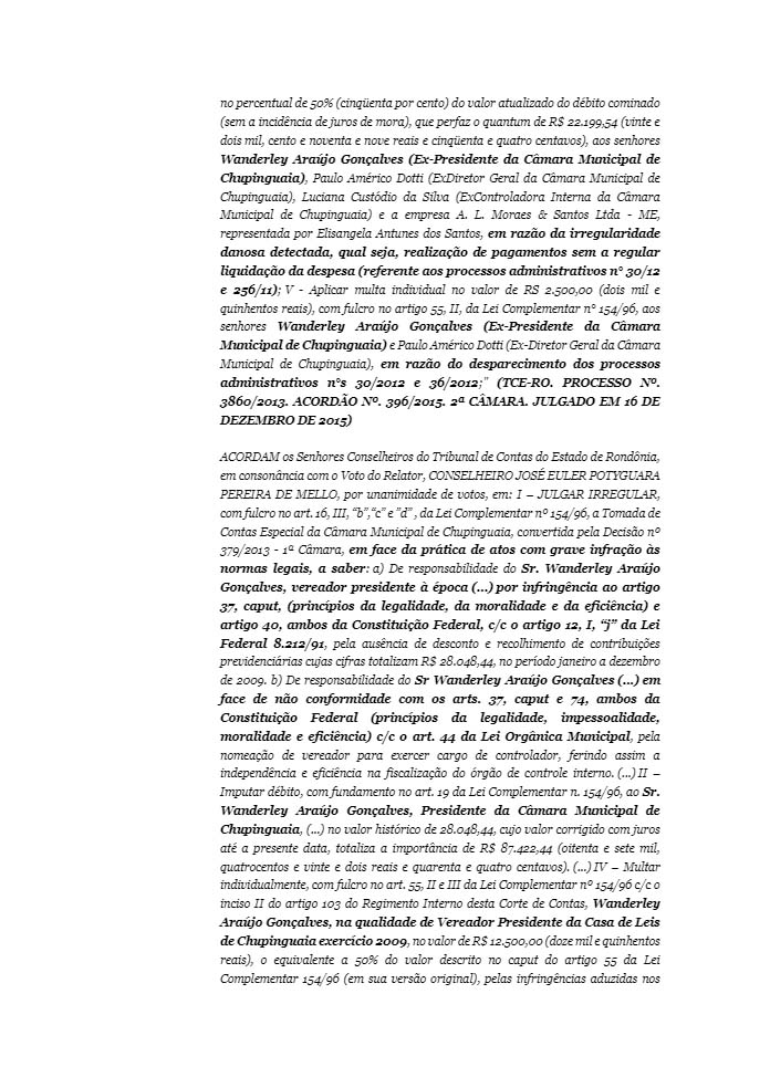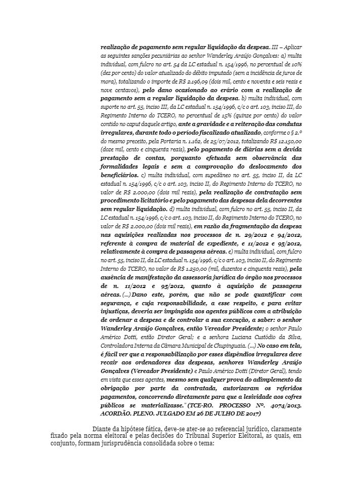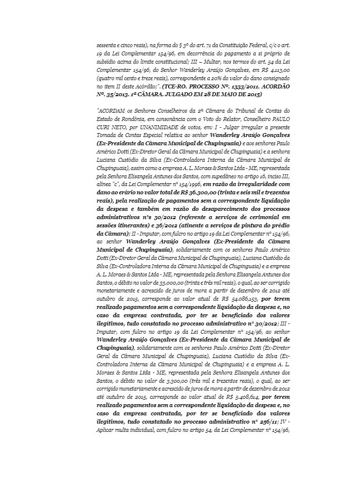 Um deles trata do próprio aumento do pagamento dos seus subsídios de janeiro a setembro de 2010. Outro refere-se à realização de pagamento no valor de R$ 36 mil sem a correspondente liquidação da despesa e também em razão do desaparecimento de processos administrativos n° 30/2012, referente a serviços de cerimonial em sessões itinerantes e serviços de pintura do prédio da Câmara); o terceiro trata da ausência de desconto e recolhimento de contribuições previdenciárias e pagamento de diárias sem a devida prestação de contas, porquanto efetuada sem observância das formalidades legais.