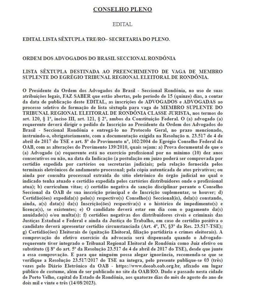 A OABRO ressalta a importância de verificar a Resolução 23.517/2017 do TSE na íntegra e informa que o edital está disponível para consulta no Diário Eletrônico da OAB. Acesse EDITAL LISTA SEXTUPLA