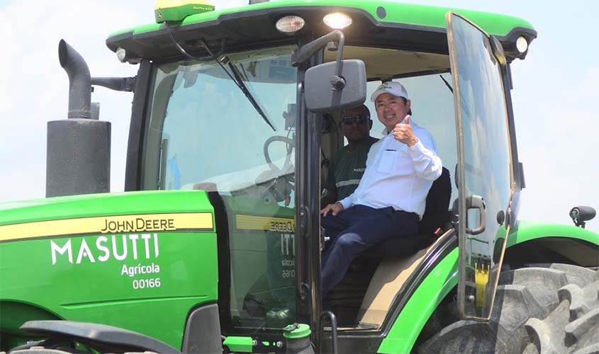 A bordo de uma gigantesca plantadeira e divulgando o potencial agrícola de Vilhena em rede nacional, o prefeito Eduardo Japonês participou hoje da abertura nacional do plantio de soja da safra 2019/2020 na Fazenda Jaqueline, em Vilhena. Realizado com a presença de autoridades municipais, estaduais e nacionais, bem como empresários e pesquisadores, o evento foi transmitido ao vivo para todo o Brasil pelo Canal Rural.
