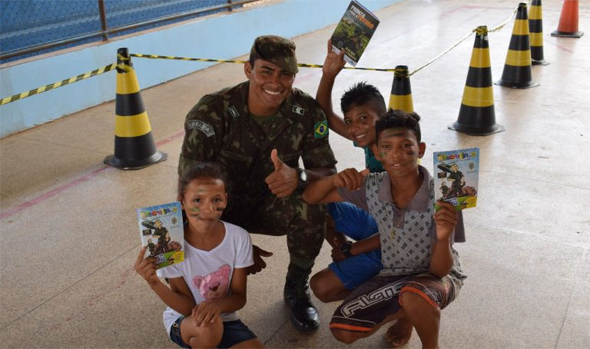 Crianças recebem cartilhas mostrando ações do Exército Brasileiro