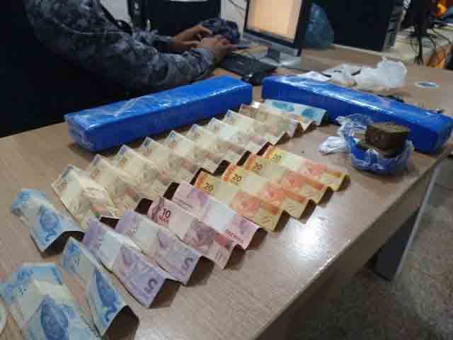 No local, um indivíduo estava nervoso e tentou fugir, mas logo foi alcançado e abordado com o apoio de policiais do Núcleo de Inteligência (NI). O homem de 29 de anos faz uso de tornozeleira eletrônica e responde na justiça pelo crime de tráfico de droga. Populares informaram que o suspeito havia deixado uma sacola onde ele estava, na qual os policiais encontraram um tablete de drogas do tipo maconha, pesando 0,898 Kg. Diante da suspeita e com permissão do infrator, foram realizadas buscas no interior de sua residência, e lá encontrados mais 2,200 Kg de maconha, uma balança de precisão e dinheiro em espécie.