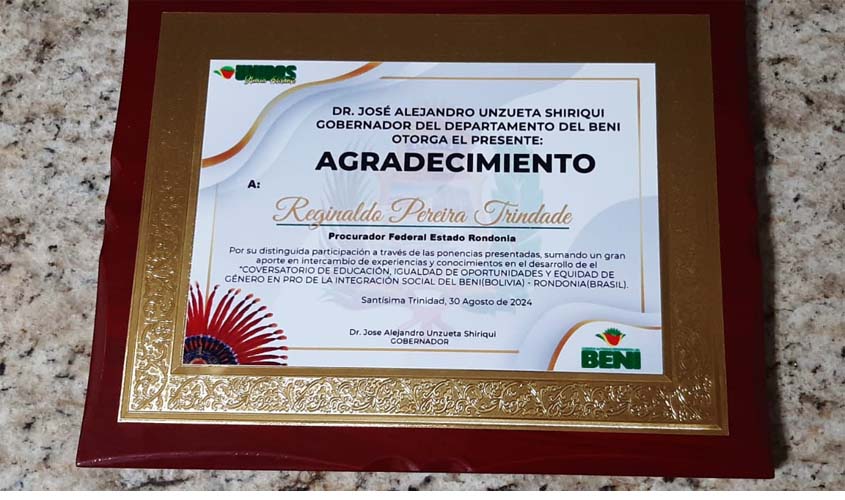 CONDECORAÇÕES. Os representantes brasileiros receberam distinções do Governo do Departamento de Beni e da Universidad Autónoma Del Beni José Ballivián. Durante o seminário mencionado, eles receberam, das mãos do próprio Governador Dr. Jose Alejandro Unzueta Shiriqui, placa contendo certificado de “agradecimiento”. Mais cedo, na manhã da sexta-feira, durante a visita àquela instituição, eles receberam, do Reitor Phd Jesús Egüez Rivero, o troféu de “reconocimiento”, além de a instituição de ensino superior ter conferido a todos da delegação brasileira distinção de “ilustre visitante” da universidade.