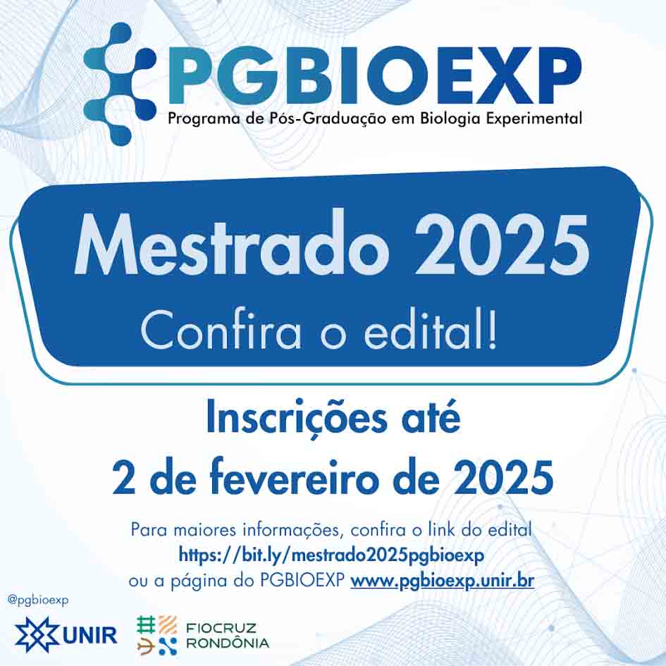O Programa de Pós-Graduação em Biologia Experimental (PGBIOEXP), ofertado em formato associativo entre a Fiocruz Rondônia e a Universidade Federal de Rondônia (UNIR), está com inscrições abertas no processo seletivo para preenchimento de vagas no curso de mestrado, com ingresso no primeiro semestre de 2025. São ofertadas 22 vagas nas áreas de relação Parasito-Hospedeiro e Biotecnologias Aplicadas a Saúde, e as inscrições podem ser feitas gratuitamente até dia 2 de fevereiro, por meio da plataforma do Campus Virtual – Fiocruz (clique aqui). Para mais detalhes do processo de seleção, acesse aqui o edital.