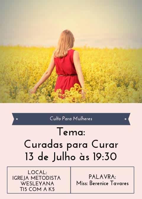 JI-PARANÁ RO – Consciente de que muitas mulheres vivem tempos difíceis na atualidade, que incluem sofrimentos que levam à depressão e outros problemas graves tanto físicos quanto espirituais, o Ministério ANAS, da igreja Metodista Weslyana, Sede de Ji-Paraná, realiza neste sábado (13) às 19h30, um Culto especial para as Mulheres que tratará o tema: Curadas para Curar.