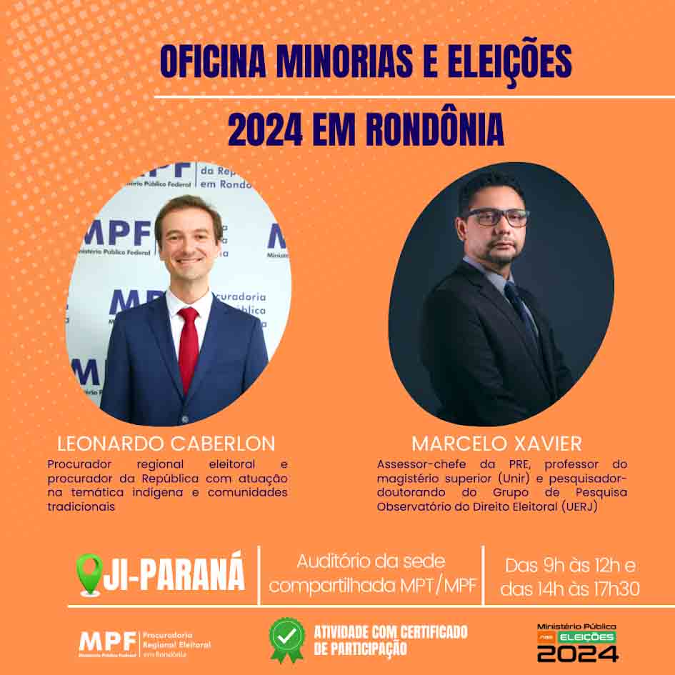 O Ministério Público Eleitoral vai realizar a Oficina Minorias e Eleições 2024 em Ji-Paraná na próxima terça-feira (19). O objetivo é capacitar lideranças de comunidades indígenas, quilombolas e de periferia para a participação política e registro de candidaturas coletivas. Com uso de linguagem fácil e de caráter suprapartidário, as oficinas buscam mudar a realidade de baixa representatividade dessas minorias nas câmaras de vereadores e nas prefeituras.