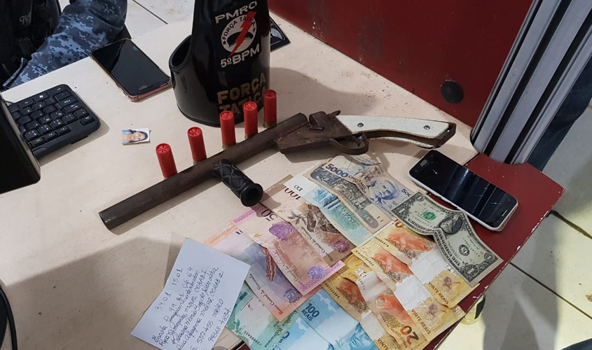 Os passageiros foram flagrados dentro de um automóvel modelo Gol, de cor vermelha, com uma escopeta calibre 12 com vários cartuchos intactos.