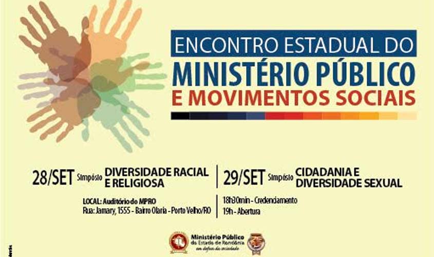 O Ministério Público do Estado de Rondônia, por meio do Centro de Apoio Operacional da Cidadania (CAOP-Cidadania), vai realizar nos dias 28 e 29 de setembro, no auditório do edifício-sede da Instituição em Porto Velho, o Encontro Estadual do Ministério Público e Movimentos Sociais, abordando os temas "Cidadania e Diversidade Sexual" e "Diversidade Racial e Religiosa".
