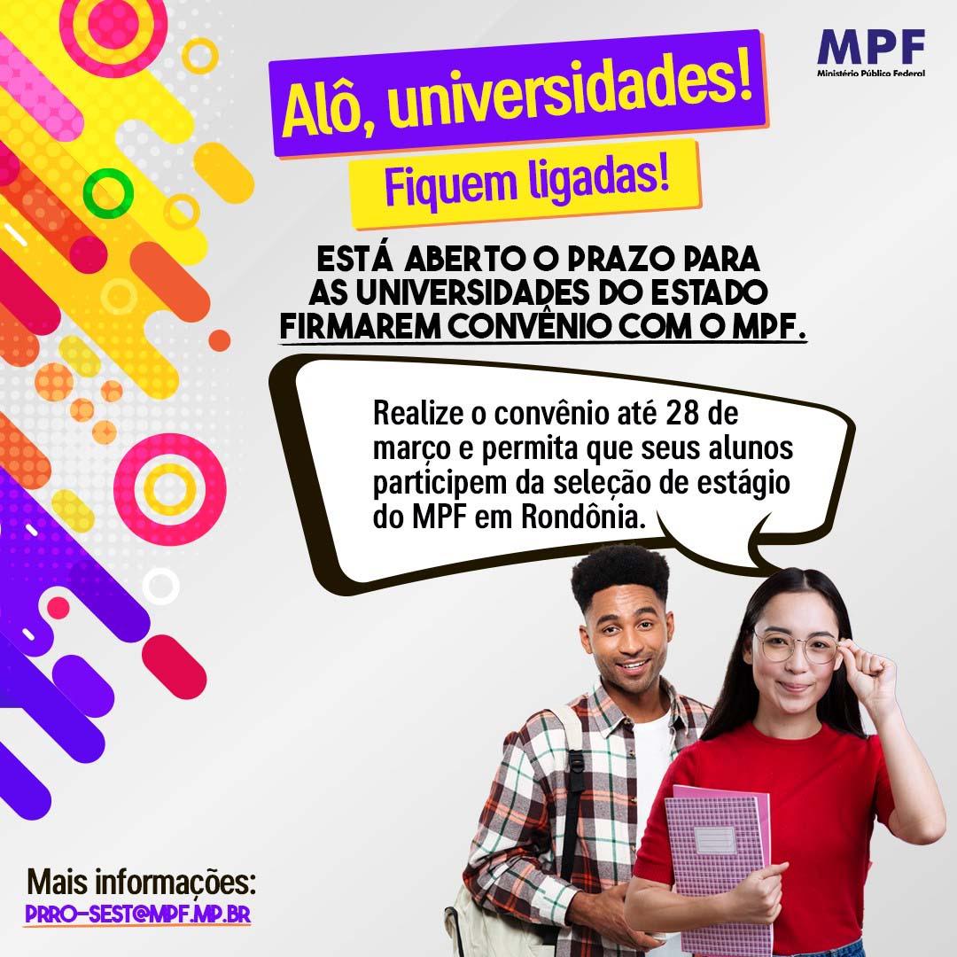 O Ministério Público Federal (MPF) em Rondônia está chamando as faculdades para credenciamento e, com isso, formalizarem termo de convênio. O documento é essencial para que estudantes possam participar da seleção para estágio no MPF. O prazo para credenciamento vai até 28 de março (próxima sexta-feira).
